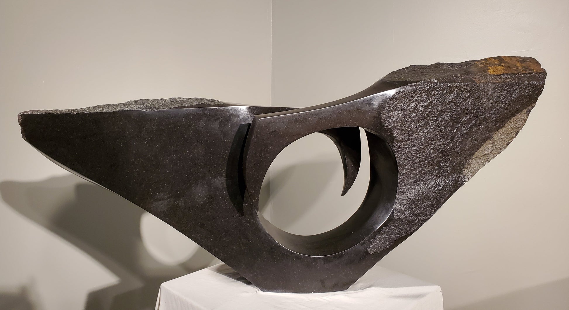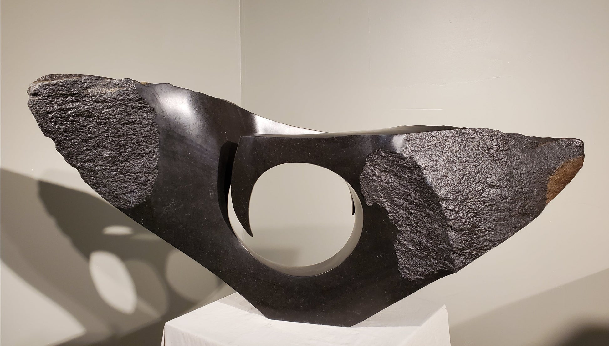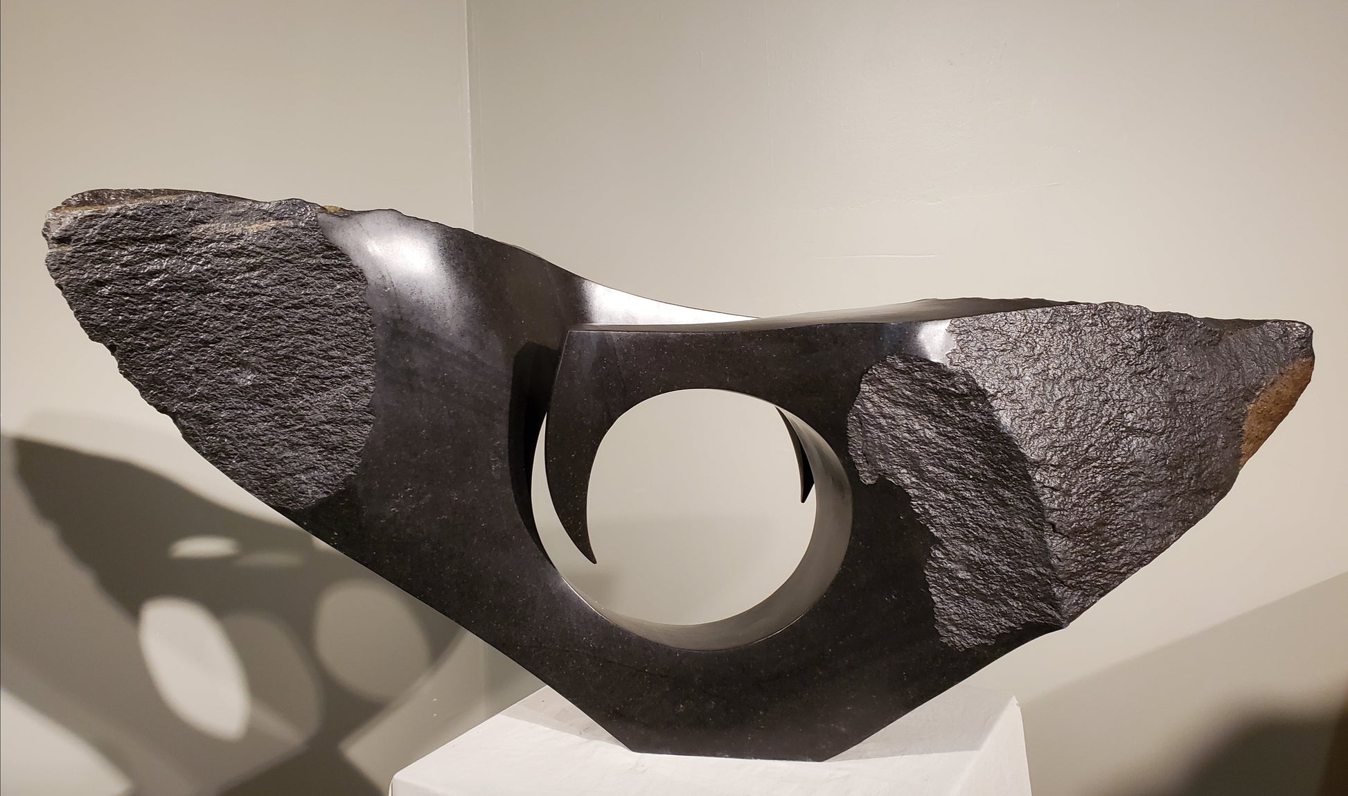 We are fortunate enough to have this sculpture in our collection. This striking piece, carved from a single piece of spring stone, features a circular void at its center, creating a dynamic interplay of light and shadow that draws the eye.