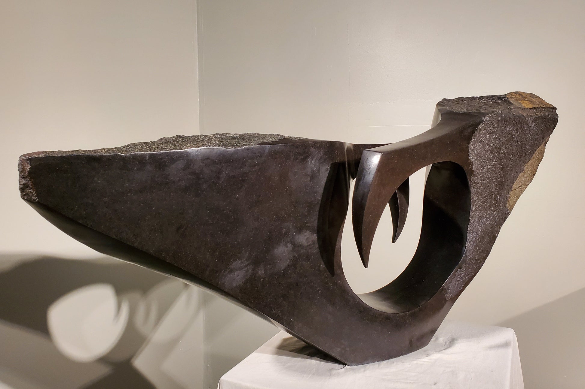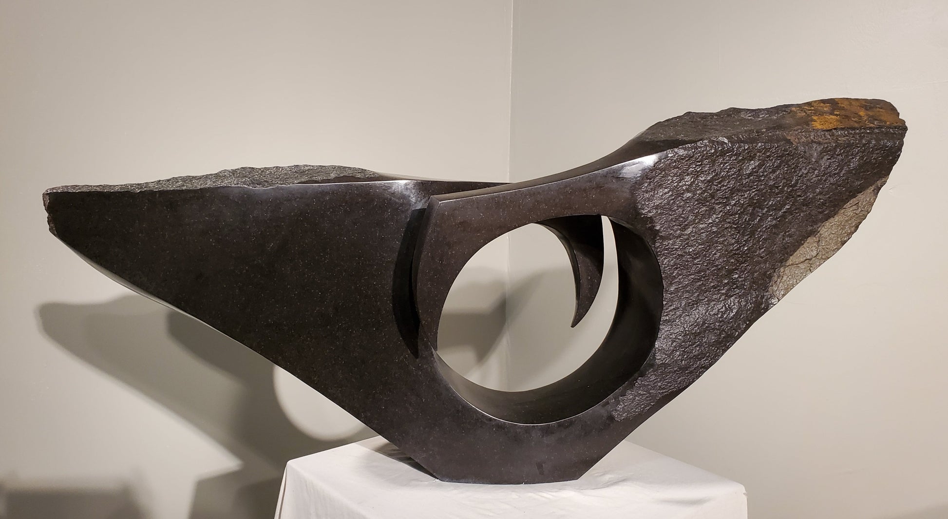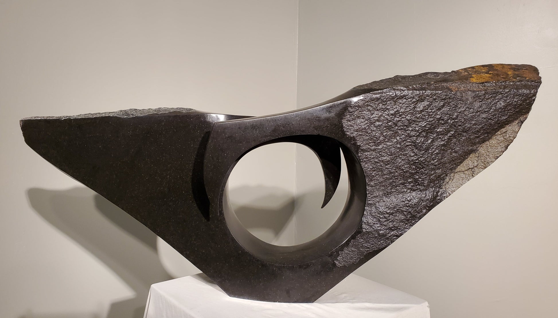 We are fortunate enough to have this sculpture in our collection. This striking piece, carved from a single piece of spring stone, features a circular void at its center, creating a dynamic interplay of light and shadow that draws the eye.