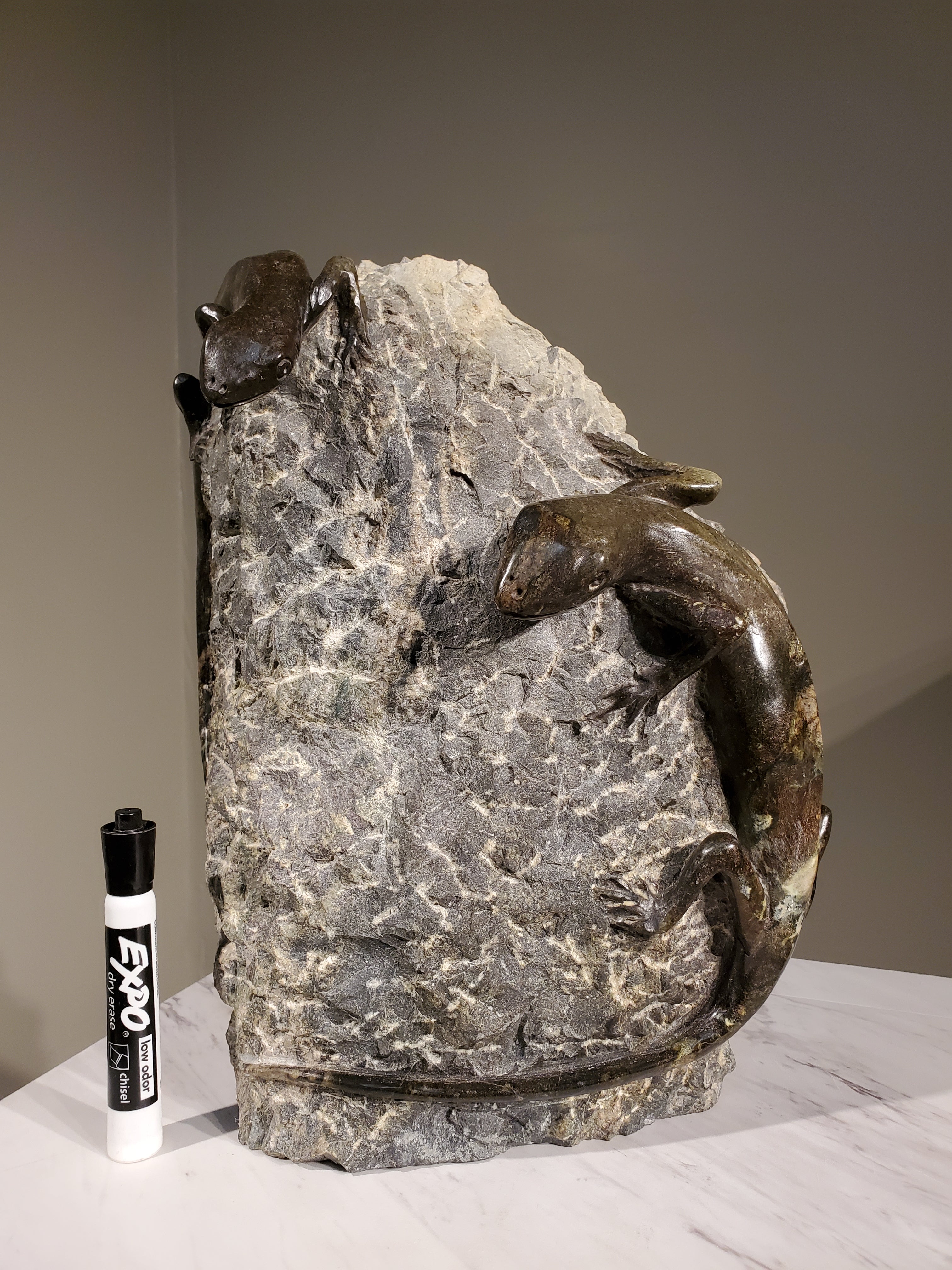 This sculpture of lizards climbing on the rocks was created from a single piece of serpentine stone, in Zimbabwe, by Clephas Zvirevo. Because each piece is created by hand, and the coloration in each stone is different, the sculpture you are looking at is exactly the one you will receive. Please keep in mind that because these are natural stones, there are always flaws and imperfections. We have taken the clearest photos possible to show everything, but we believe that is also the beauty of these sculptures, that they were not produced in a factory, but rather by actual people, using natural stones quarried in the hills and mountains of Zimbabwe.
