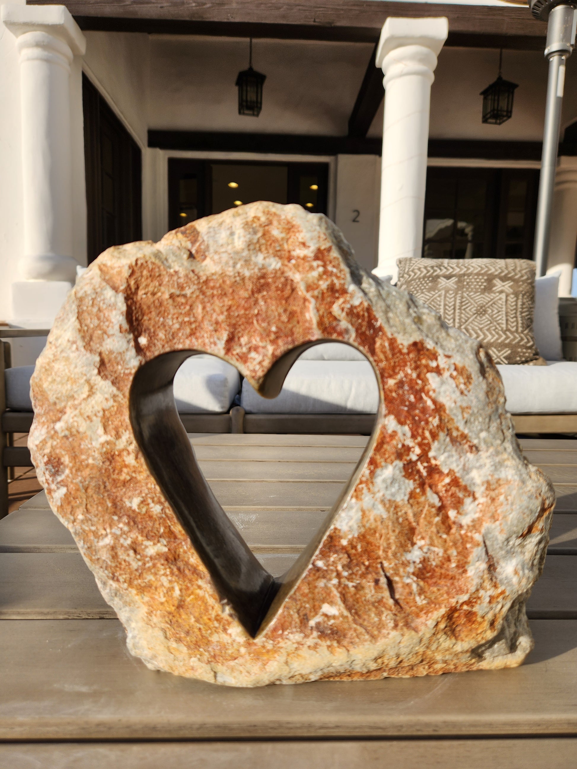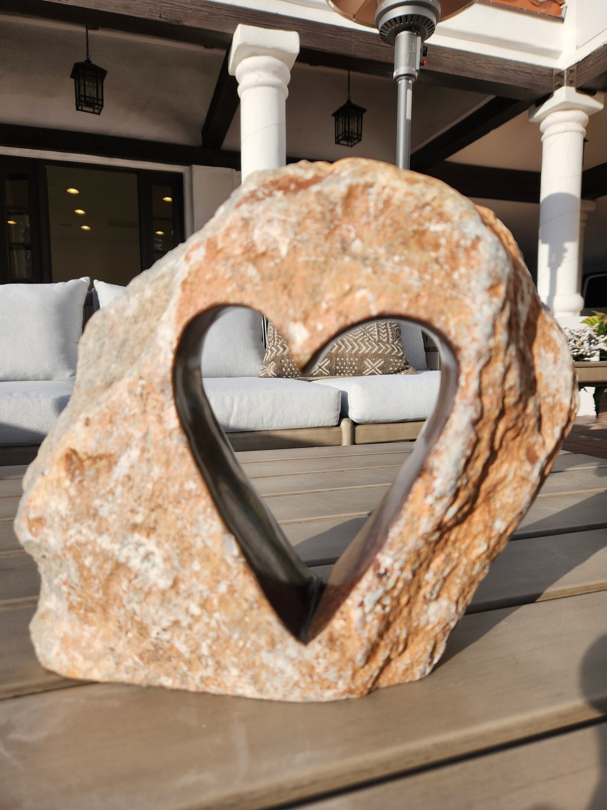 The perfect anniversary, wedding, or Valentine’s Day gift! This heart was sculpted by hand from a single piece of serpentine stone. The inner, shiny, darker area is polished using only floor wax. The sculpture is first shaped, using a combination of chisels, rasps (files), and sometimes a grinder. At that point, the stone is just a greyish/whitish color. Once shaped, the sculpture will still be rough because of the rasp’s rough teeth, so the next stage is sanding to get the texture smooth. In this piece, only the inner part of the heart is sanded. Each grit of sandpaper, from the roughest to the finest, is used until the stone in that area is super smooth. The piece is then washed, heated with a fire, or blow torch, and then, when hot, floor wax is applied, usually with a brush. Since the stone is hot, the wax melts into the stone, and then when it cools down, the polished area is buffed out with a cloth until it shines. The outer area is left completely alone, showing the natural state that the heart emerged from.